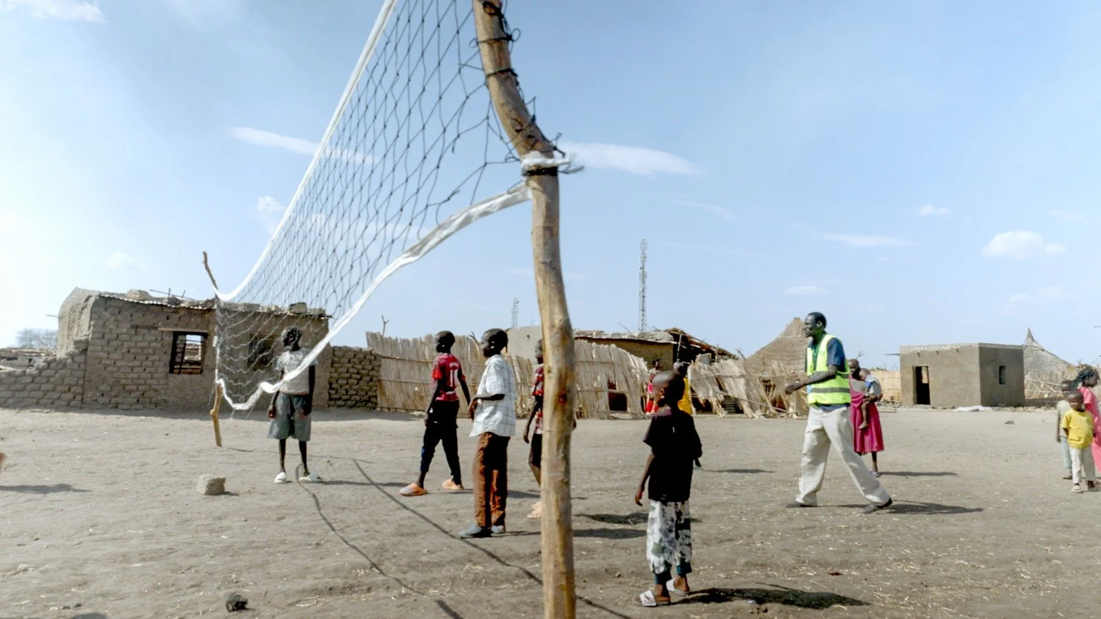 Bul Dau playing volleyball match with children at GeiGer Settlement Camp in Renk County, Jonglei State. The center has child-safe-space which is run by the Africa Development Aid (ADA) with the support from UNICEF South Sudan.